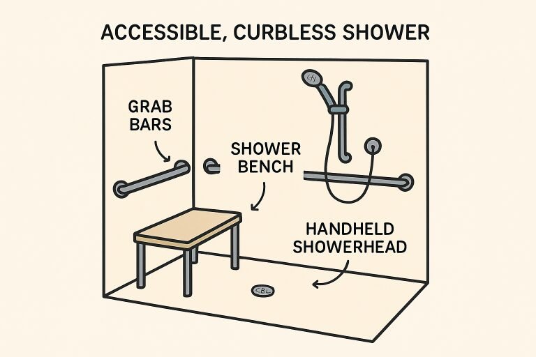 Universal design means the shower and bathroom remain usable, convenient, and welcoming for everyone—young or old, able-bodied or not. Lever-style faucets, adjustable-height vanities, wide doorways, and clear floor space benefit not only those with disabilities but also provide comfort and ease for families, guests, or any individual temporarily facing mobility limits. These features make your home inclusive, practical, and more attractive to future buyers looking for long-term comfort and usability.